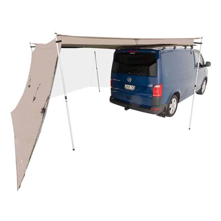 Verdict: With a simple pole-free design and high quality features, the BUSHWAKKA Next Gen Extreme 270 Awning is built for the sunny Australian weather. It features a durable ripstop canvas enforced with PU waterproof coating and a high UV 50+ sun protection rating. This awning also comes in a modern grey color with heat repelling features to keep you cool even in summer.